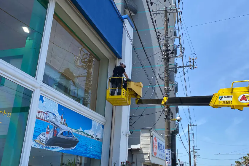 屋外看板や店舗の内装、カーラッピングのデザインから施工まで、アドノット・クリエイツがワンストップで行います。施工時の道路使用許可や看板設置に関わる許認可申請もお任せください。